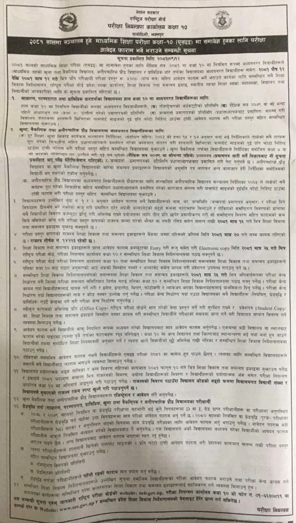 पौष १२ । माध्यमिक शिक्षा परीक्षा (एसइई) को परीक्षा आवेदन फारम खुला भएको छ । परीक्षा नियन्त्रण कार्यालयले सूचना निकालेर आजदेखि माघ १२ गते भित्र परीक्षा दस्तुर पाँच सय रुपैयाँसहित आवेदन फाराम भर्न आग्रह गरेको हो ।
